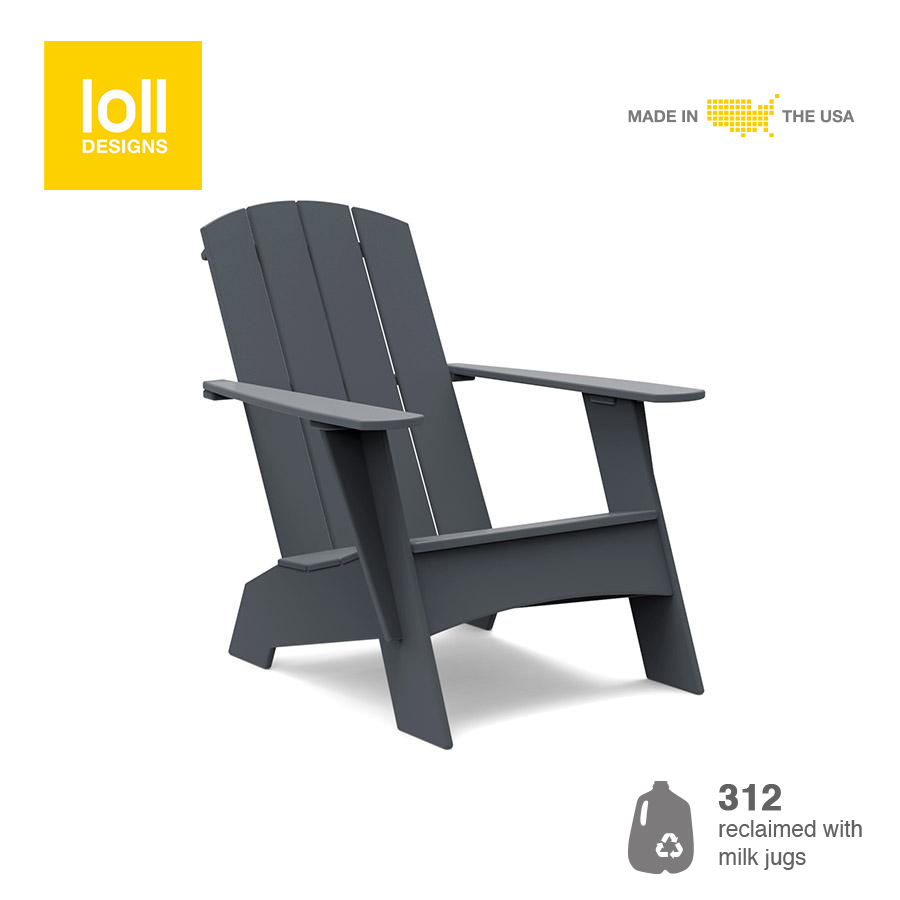 All Loll outdoor furniture is made with recycled high-density polyethylene (HDPE), one of the most commonly used plastics in the U.S. Because of its longevity, durability, and lack of maintenance, HDPE is used in countless practical applications, such as food containers, outdoor playground equipment, cutting boards, bathroom partitions, and boat cabinetry. Loll’s recycled material is sourced primarily from single-use milk jug containers.
